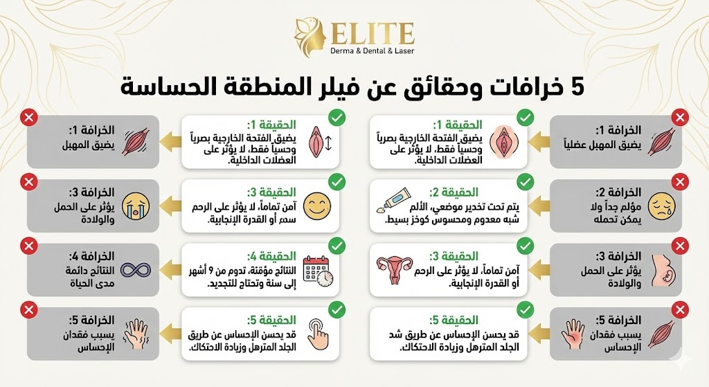 تنبيه هام: لا يؤثر الفيلر على الإحساس بشكل سلبي، بل العكس، شد الجلد المترهل قد يحسن من الحساسية في المنطقة. كما أنه لا يسبب العقم وليس له علاقة بالرحم.